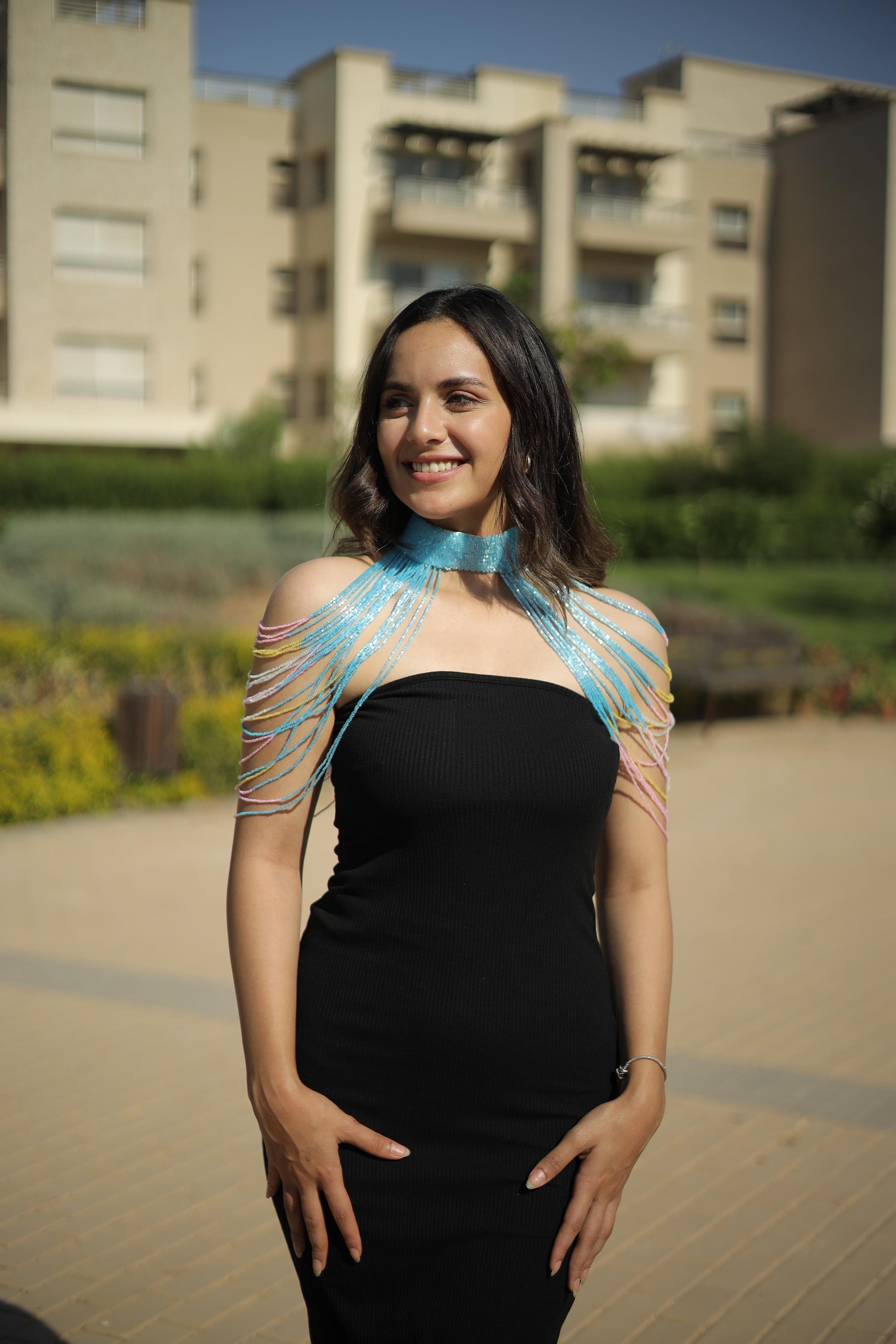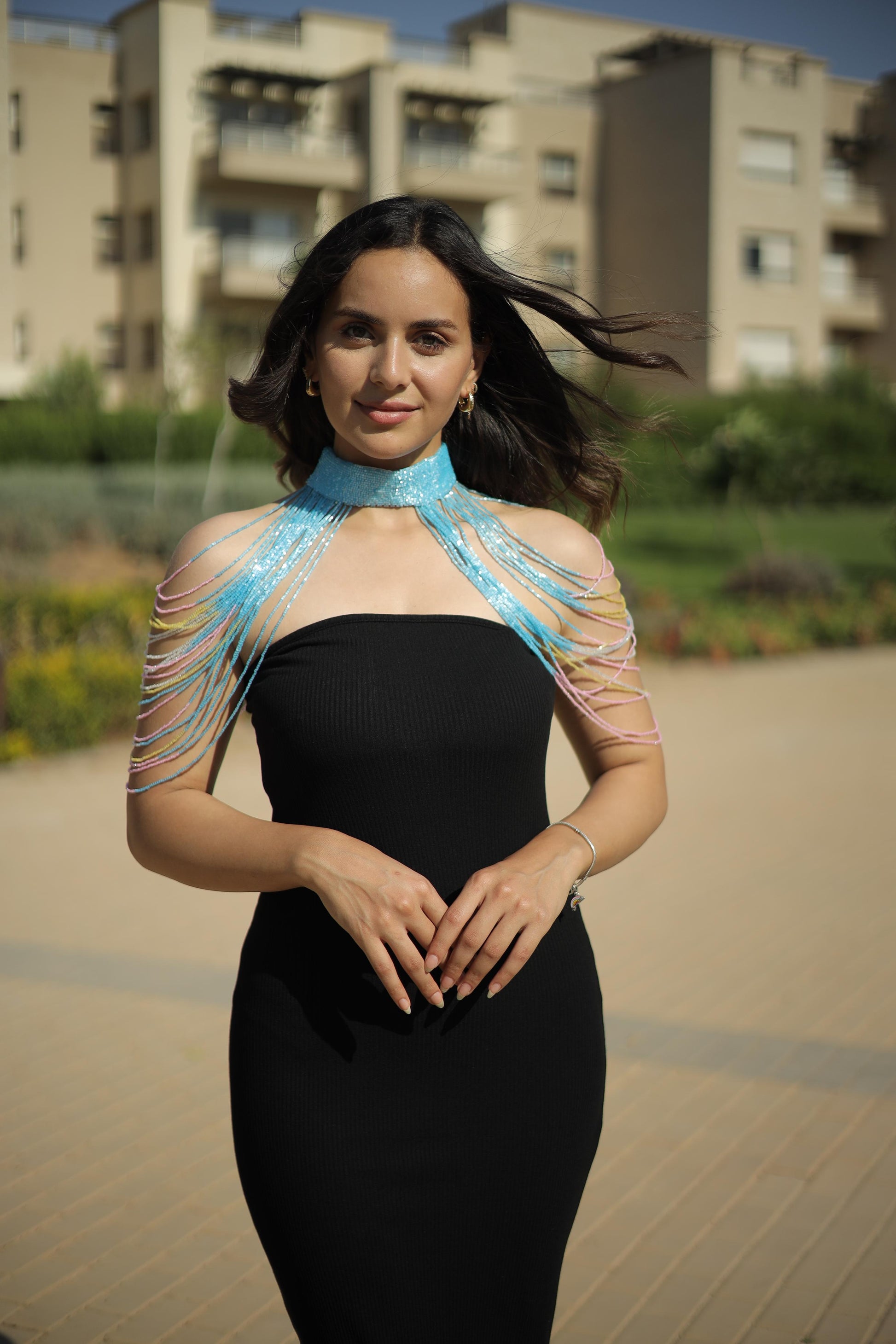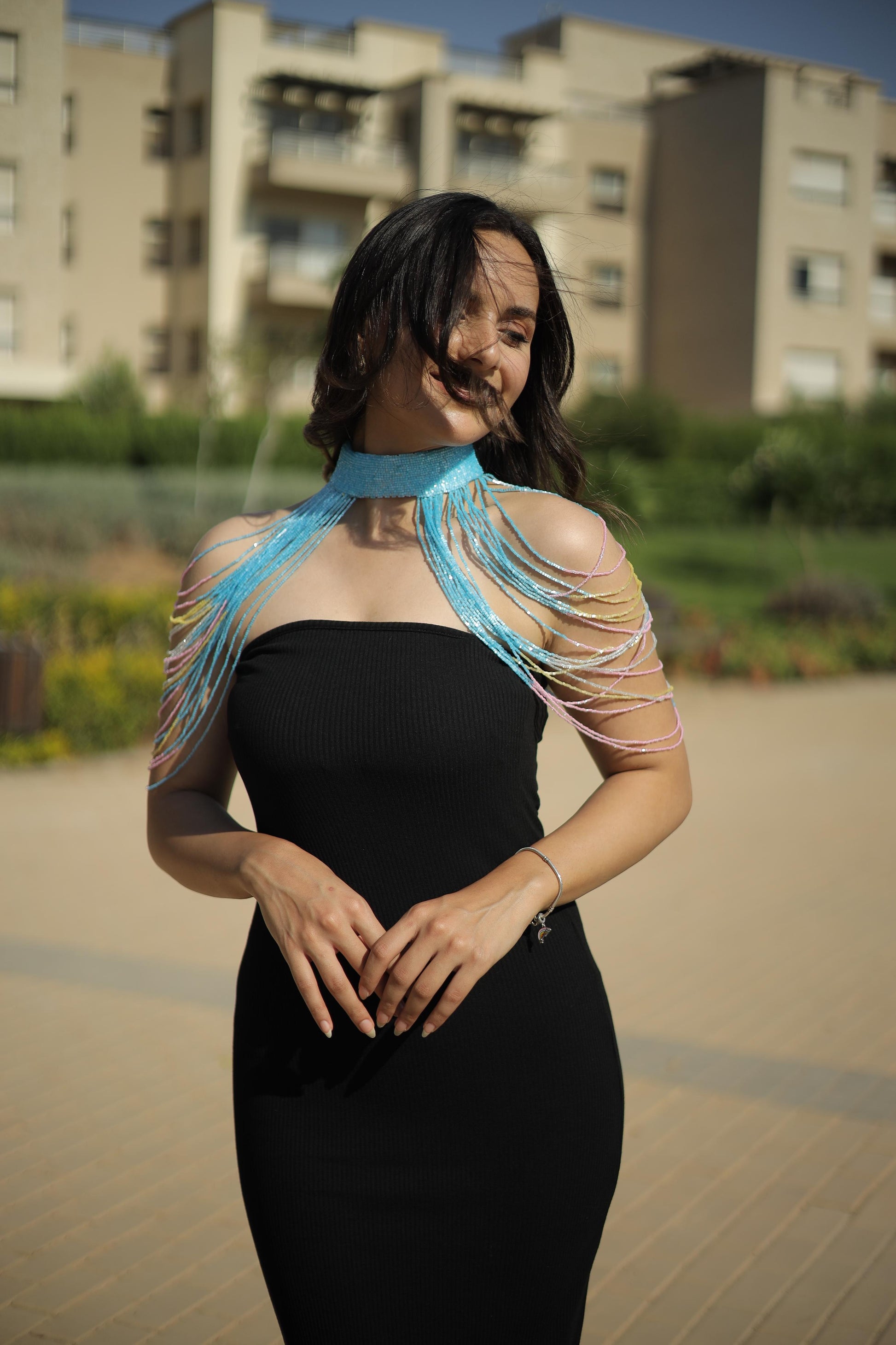 This hand beaded choker features a beautiful cascade of blue beads, creating a stunning neckline and shoulder embellishment. Crafted with expert precision, this accessory adds a touch of elegance to any outfit. Elevate your style with our Blue Hand Beaded Choker.