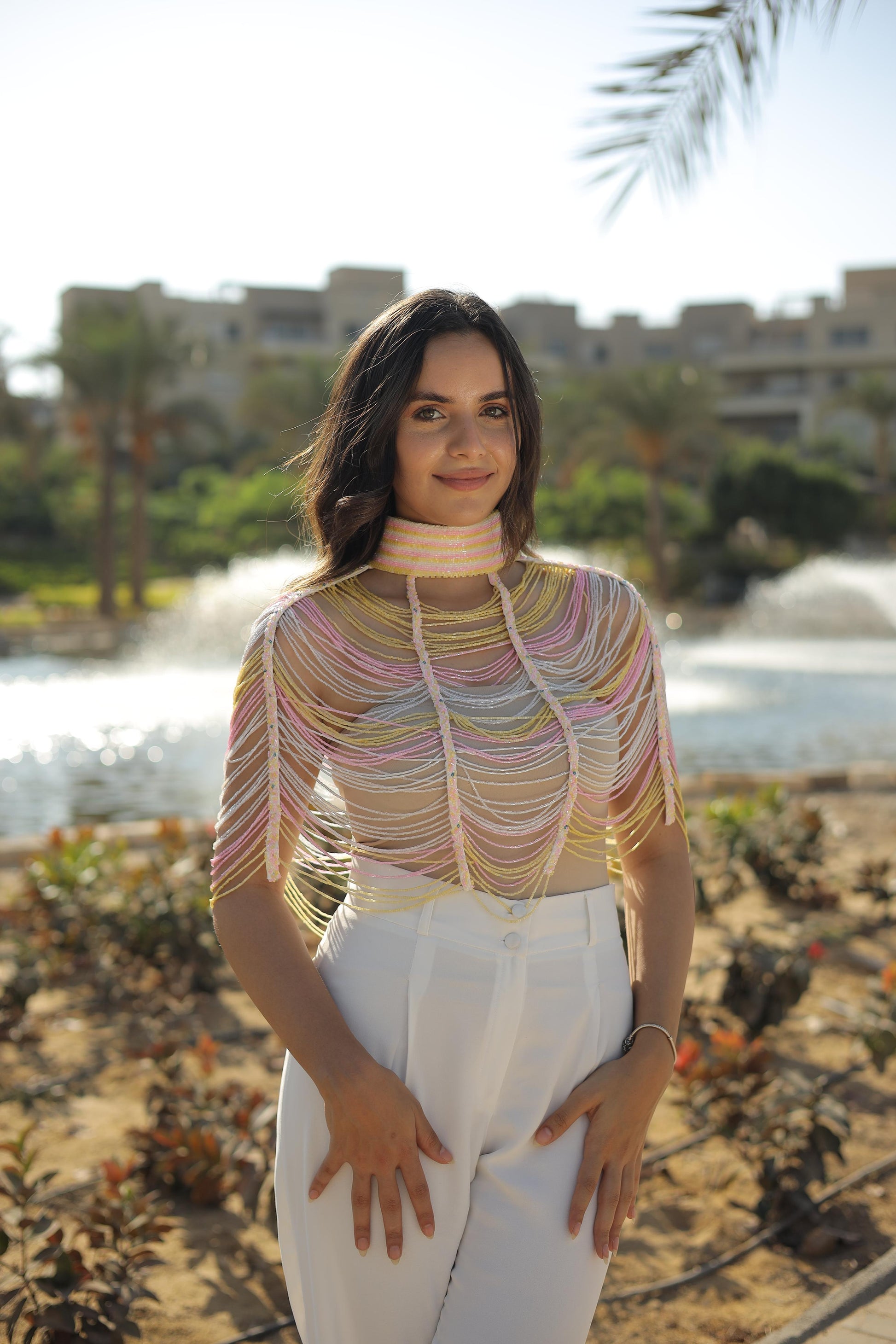 This Colored Tassel Top with Choker is a must-have for any fashion-forward individual. Made from top-quality yellow, pink, and white beads, the tassel top and accompanying choker offer a unique and stylish look. Instantly elevate any outfit with this eye-catching piece.