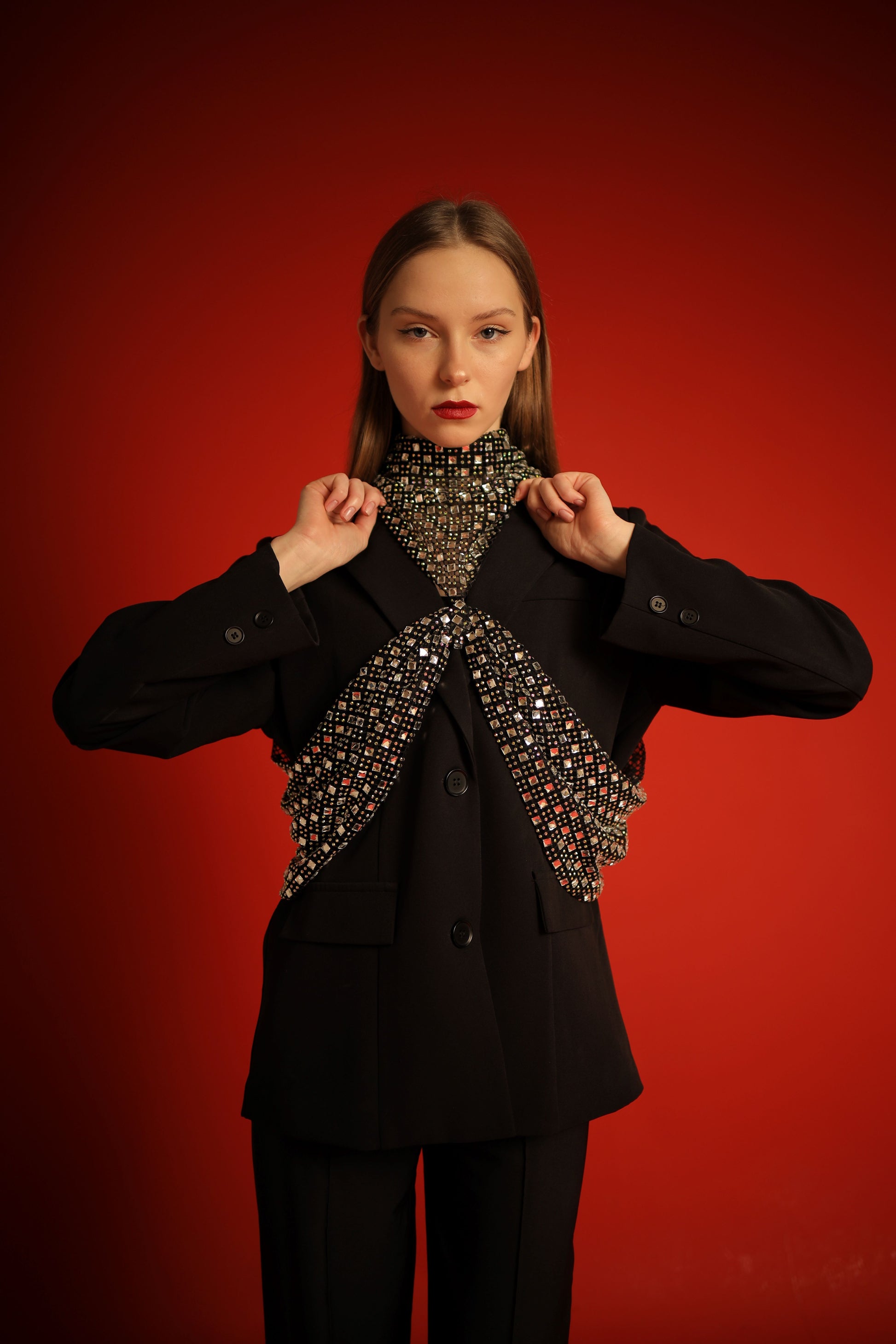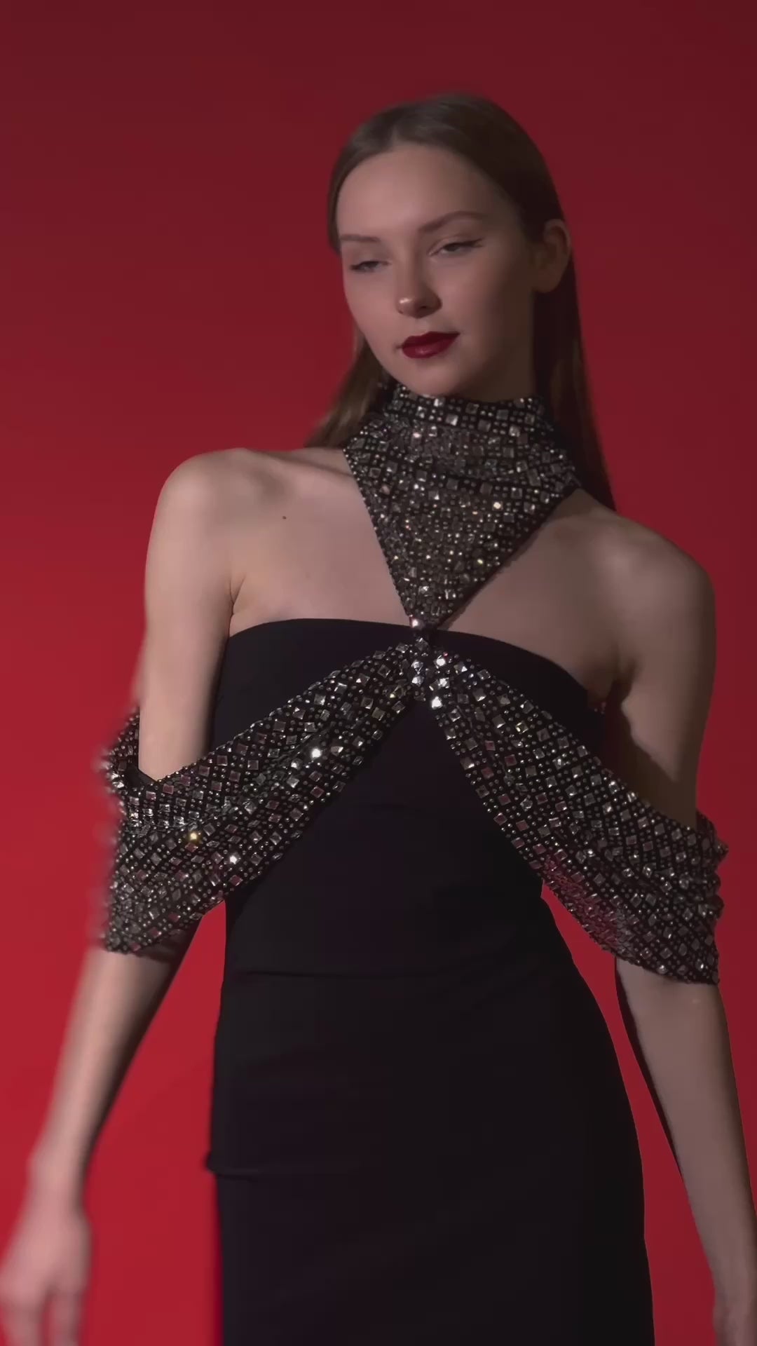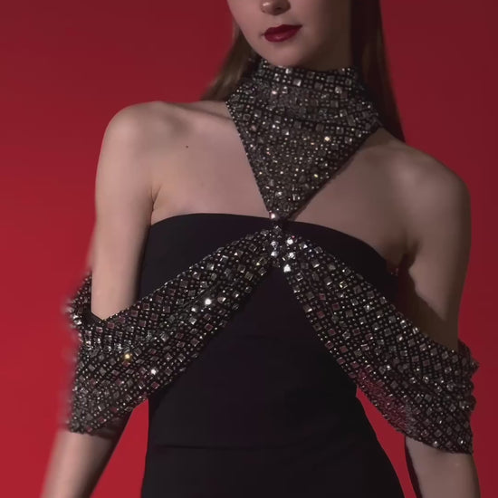 A statement shoulder wrap crafted from black mesh and hand-embellished with crystals. Designed to elevate any strapless or minimalist look, this piece adds instant drama and sparkle for evening wear or special occasions.