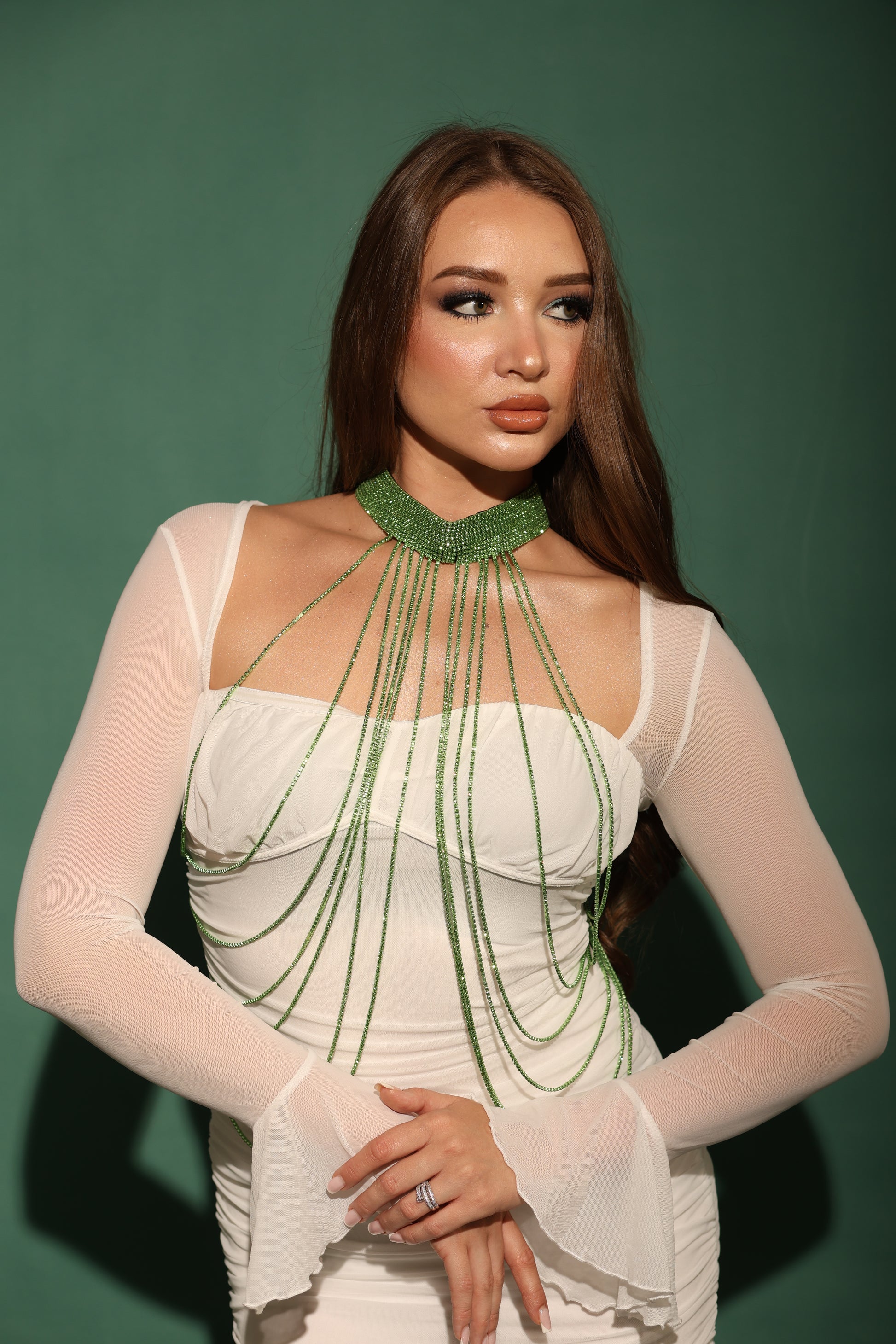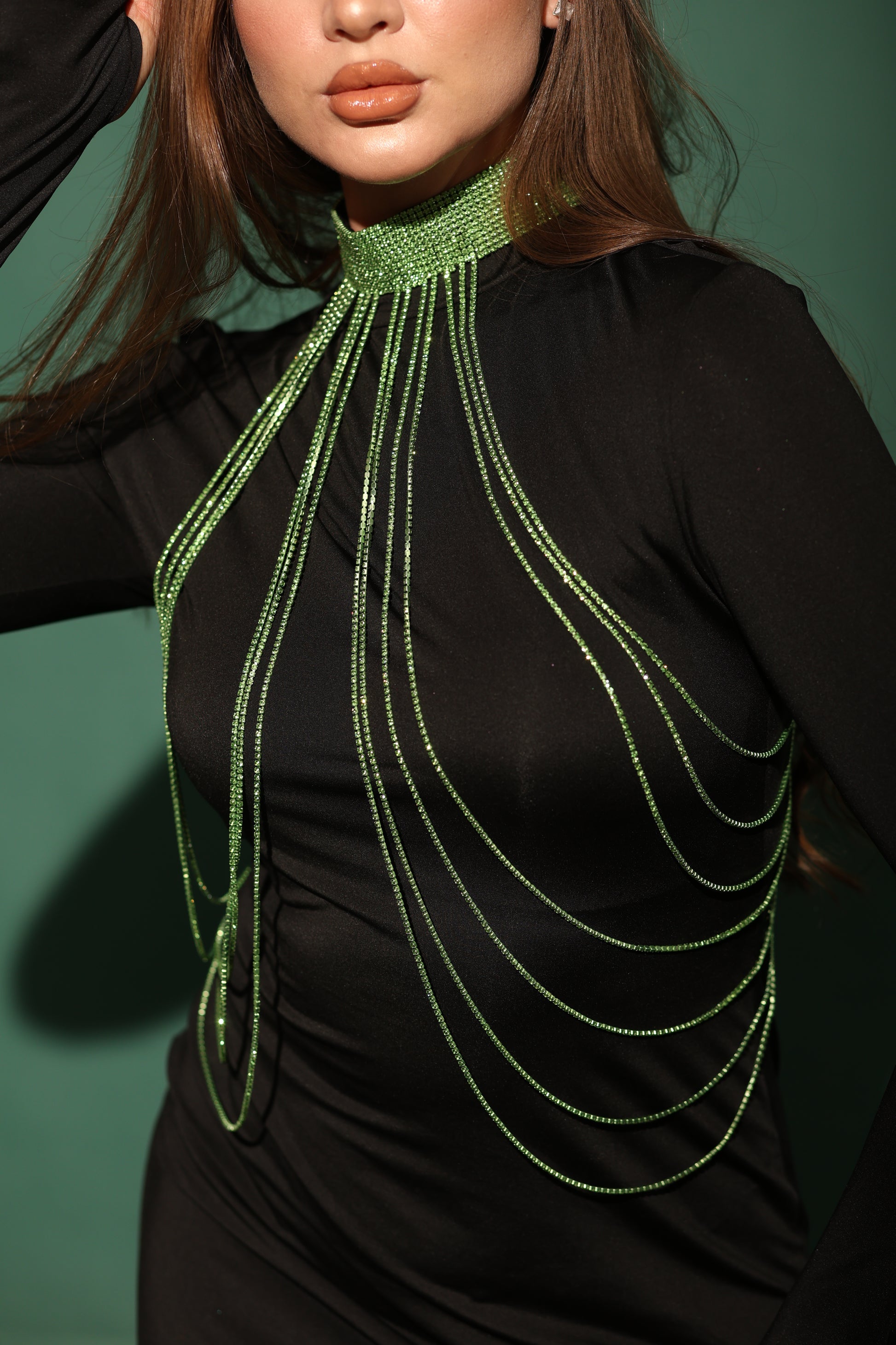A glamorous piece of a body chain —designed to elevate a basic top/dress into an elegant statement look. The piece is made of sparkling green crystals that cascade from a wide choker neckline down over the chest and sides, creating a dramatic, luxurious effect.