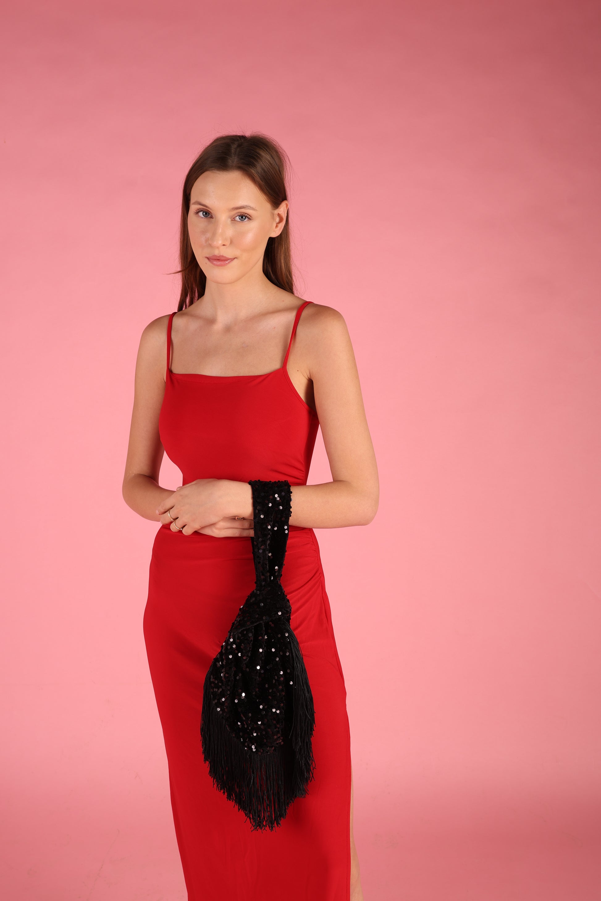 Statement fringe and high-shine sequins make this black hobo bag a must-have for evening events. It’s spacious enough for all your essentials and features a comfortable shoulder strap for a night of effortless glamour.