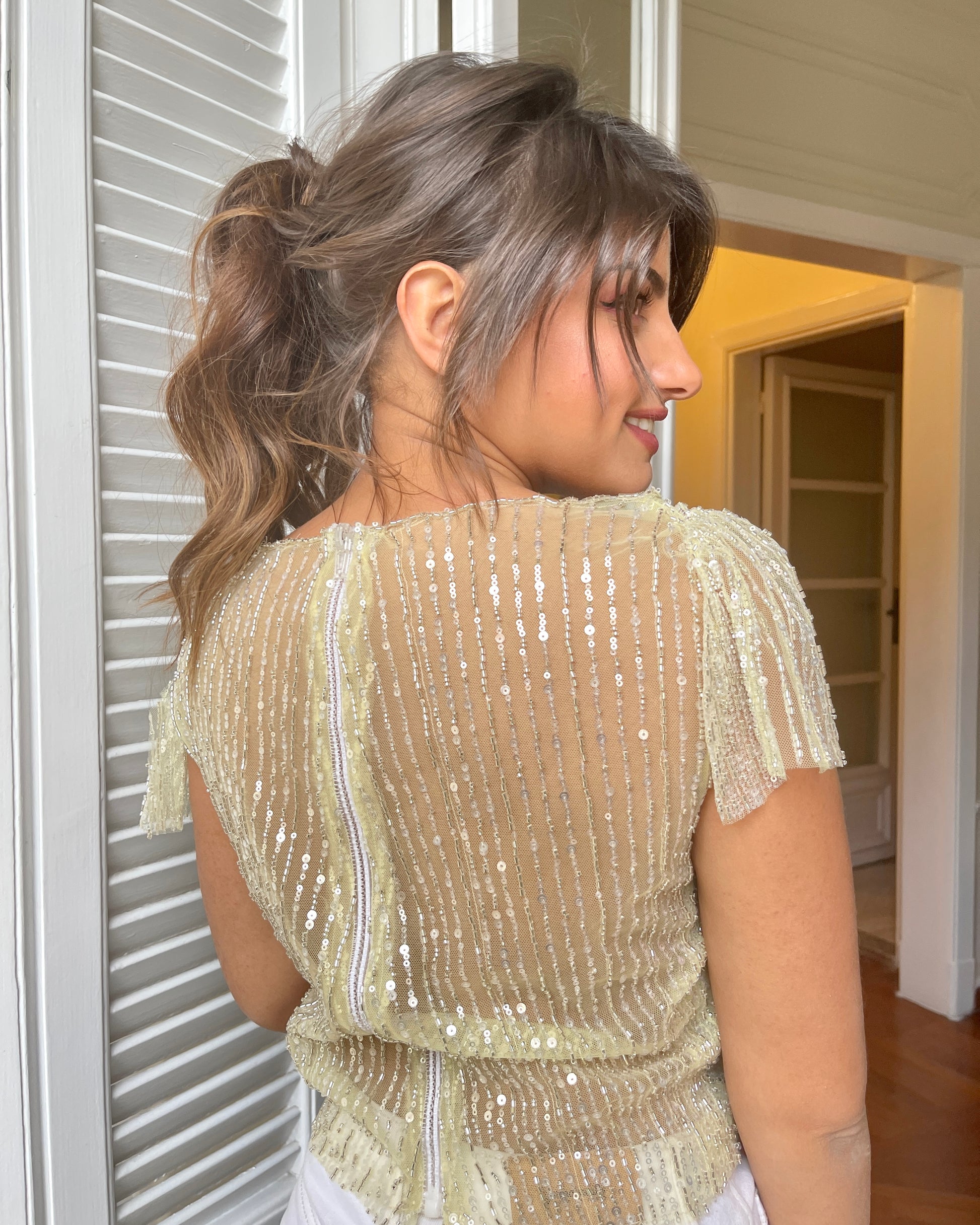 Expertly crafted with a striking combination of yellow tulle and silver beads, this top is sure to make a statement. The flowy short sleeves add a touch of elegance.